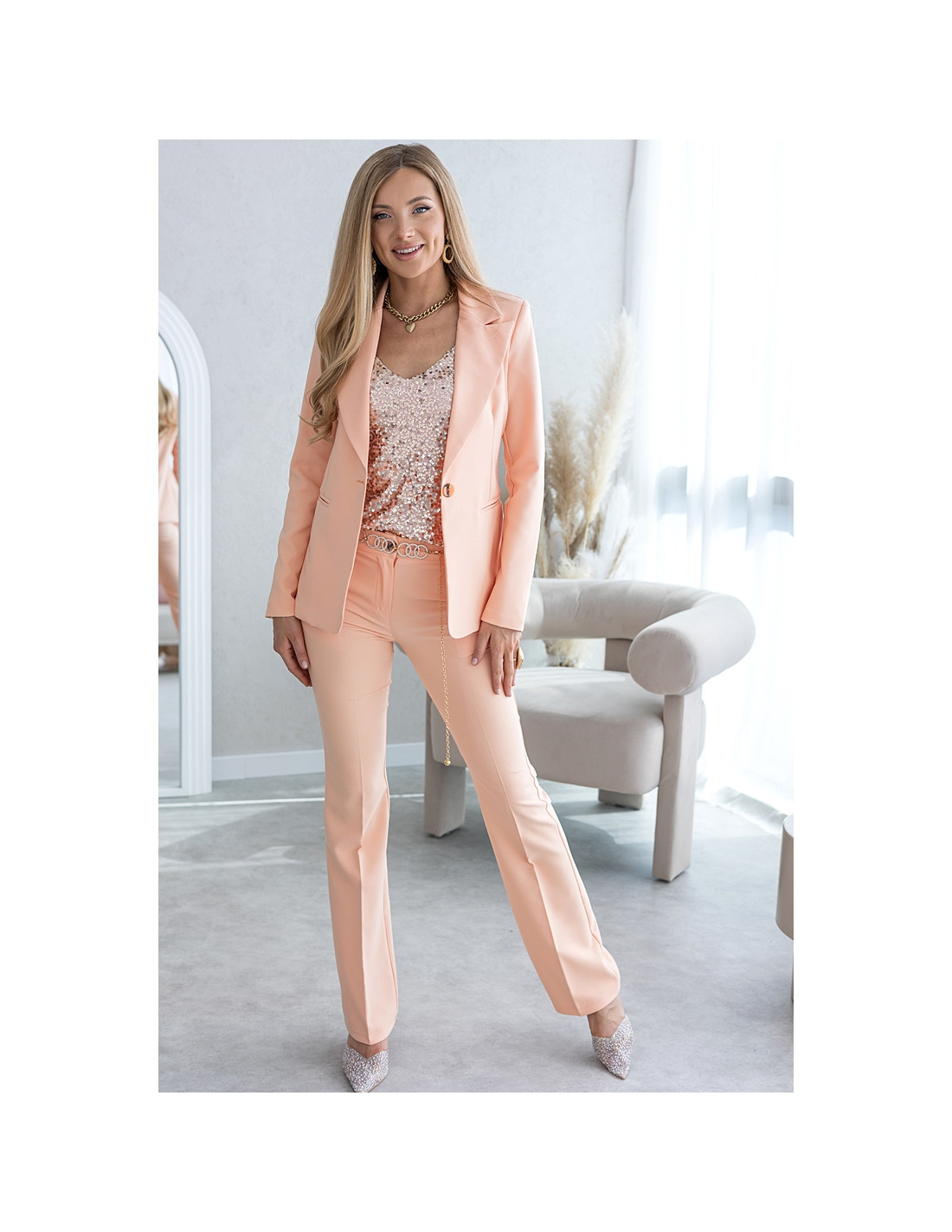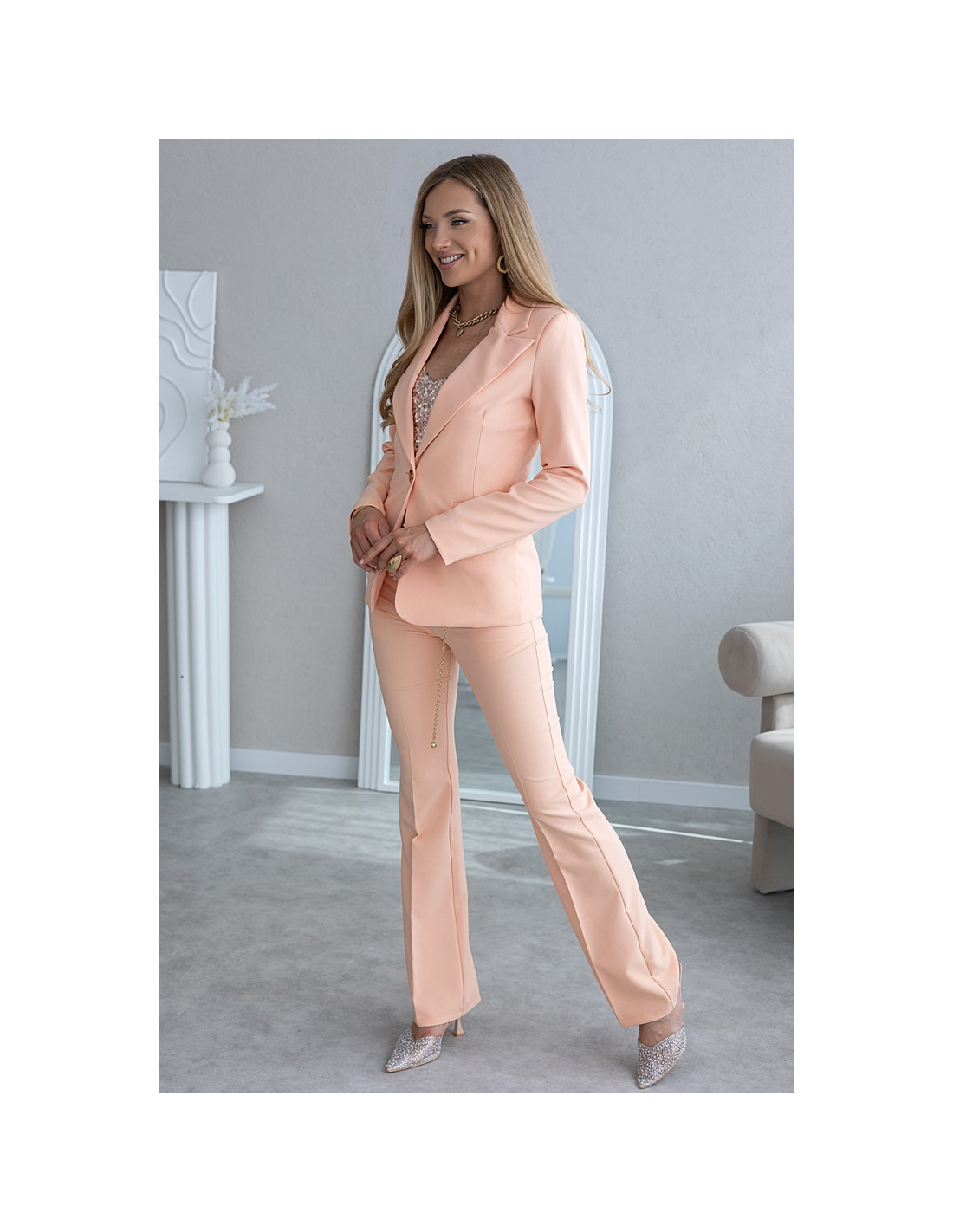 Elegancki Komplet, składający się z przedłużanego żakietu oraz spodni o kroju dzwonów.
