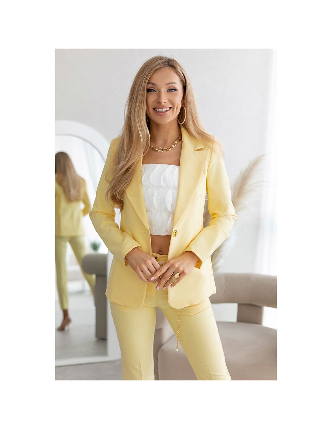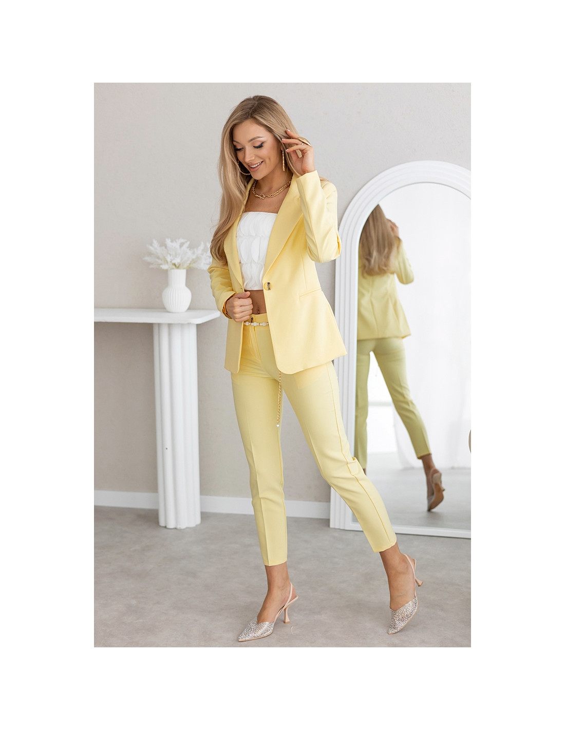 Elegancki Komplet, składający się z przedłużanego żakietu oraz spodni o kroju cygaretek.