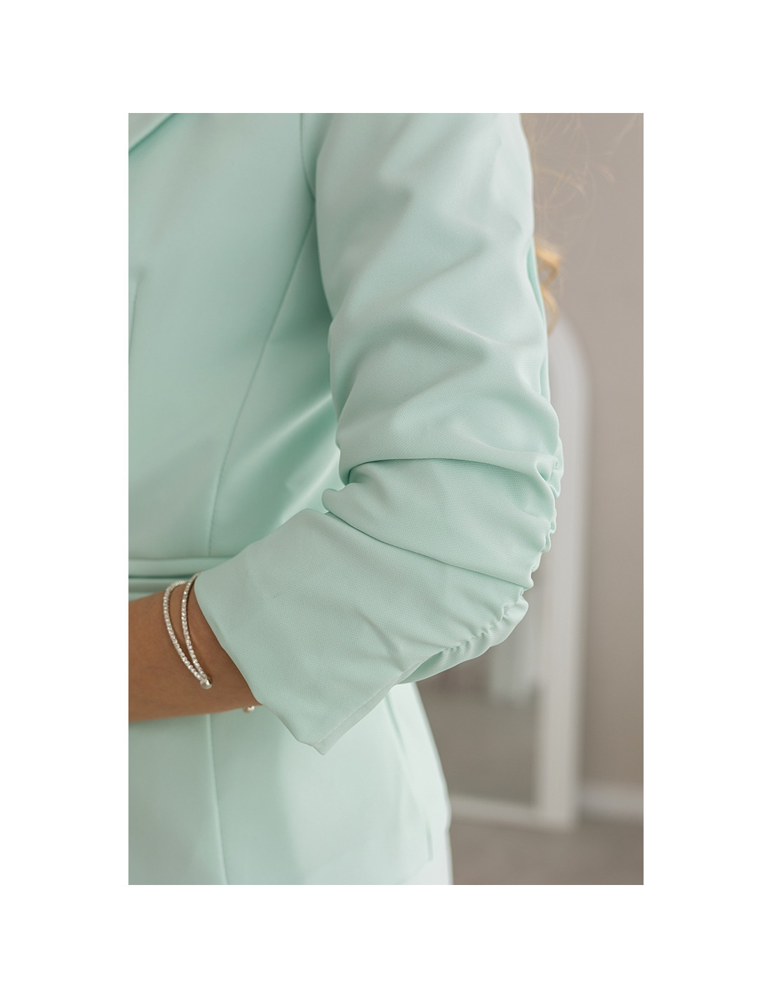 Elegancki Komplet, składający się z żakietu z marszczonymi rękawkami oraz spodni o kroju cygaretek.
